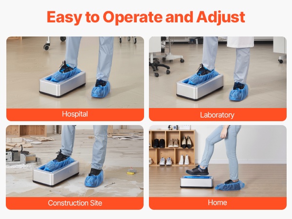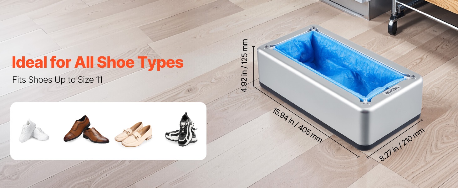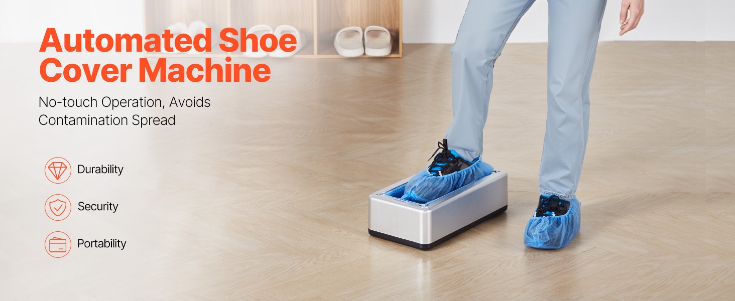 Automaattinen kenkäsuojakone helpottaa kertakäyttöisten kenkäsuojien pukemista ilman kumartumista tai käsin asettamista. Laite soveltuu kotiin, hotelleihin, sairaaloihin, laboratorioihin, työmaille ja muihin tiloihin, joissa halutaan pitää lattiat puhtaina pölystä ja ulkoa kulkeutuvasta liasta.