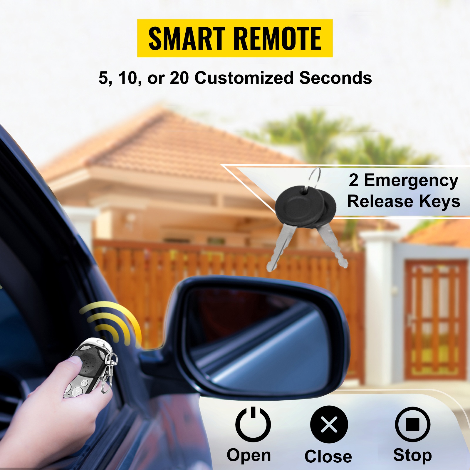 Kaukosäätimillä voit avata, sulkea ja pysäyttää portin noin 100 ft etäisyydeltä. Kaksi mekaanista hätävapautusavainta mahdollistaa portin manuaalisen avaamisen sähkökatkon tai muun häiriön aikana.
