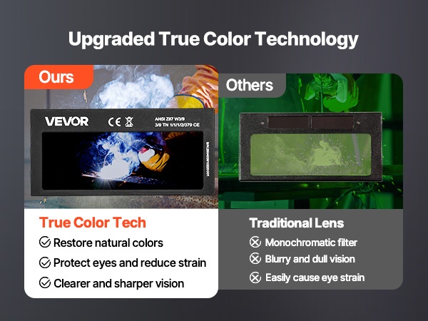 Perinteisiin, vihertävän sumean kuvan antaviin suodatinlinsseihin verrattuna true color -hitsauslinssi tarjoaa luonnollisemman värintoiston ja paremman selkeyden. Tämä vähentää silmien rasitusta ja parantaa yleistä käyttömukavuutta pidemmissäkin hitsausjaksoissa.