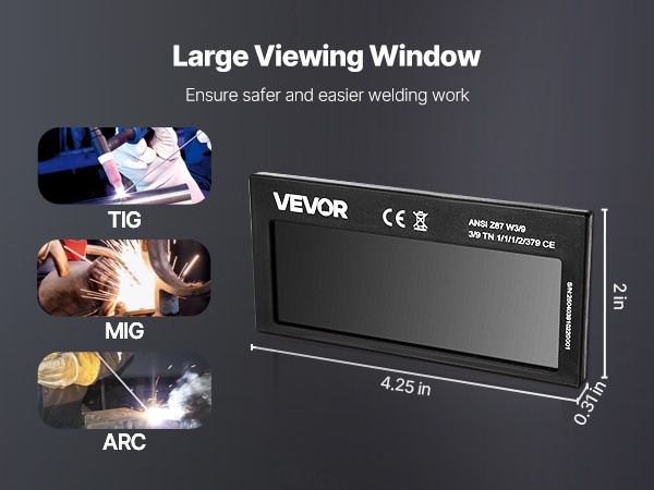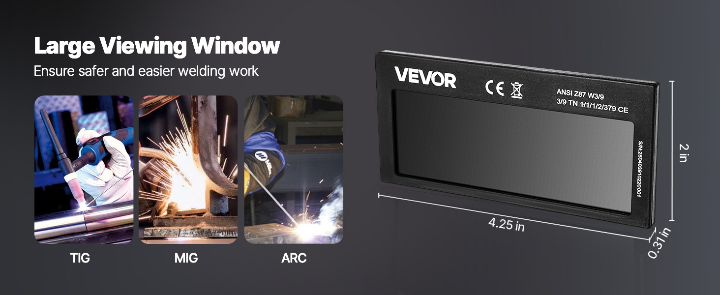 4.25" x 2" (108 x 51 mm) kokoinen katseluikkuna tarjoaa laajan ja selkeän näkökentän hitsauksen aikana. Se soveltuu hyvin TIG-, MIG- ja kaarihitsaukseen ja auttaa hahmottamaan saumaa ja työkappaletta paremmin, mikä tukee turvallista työskentelyä.