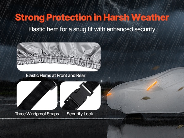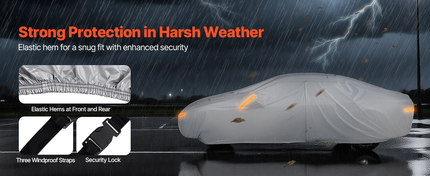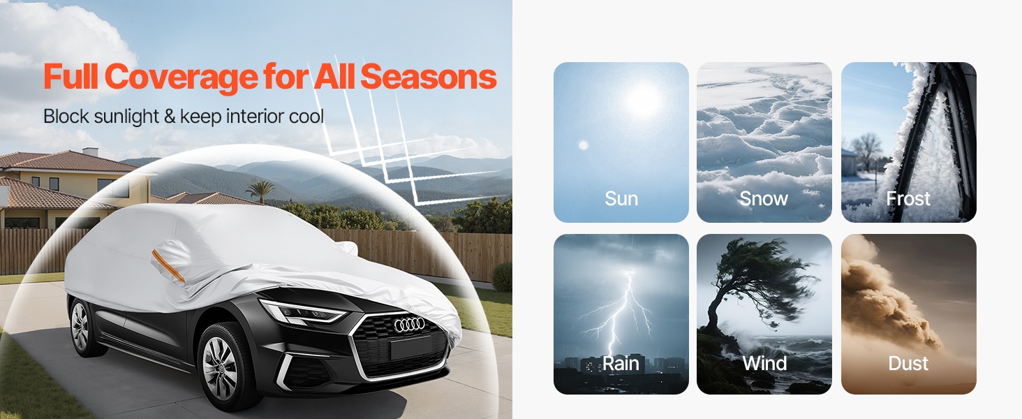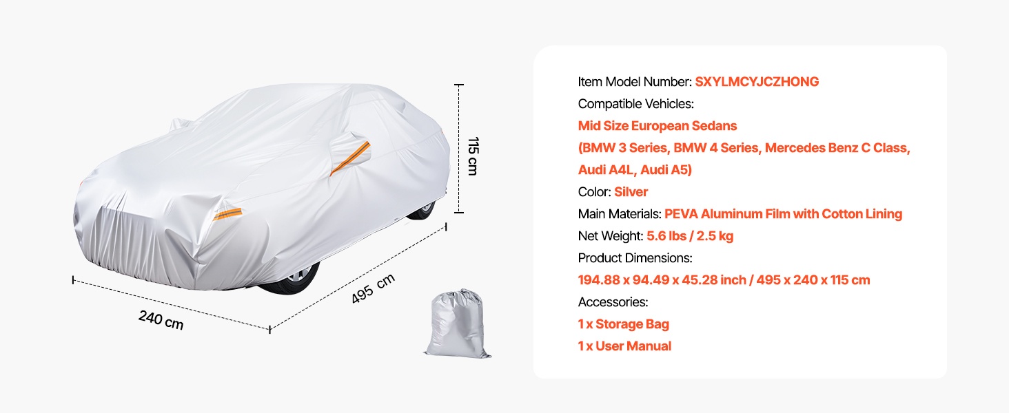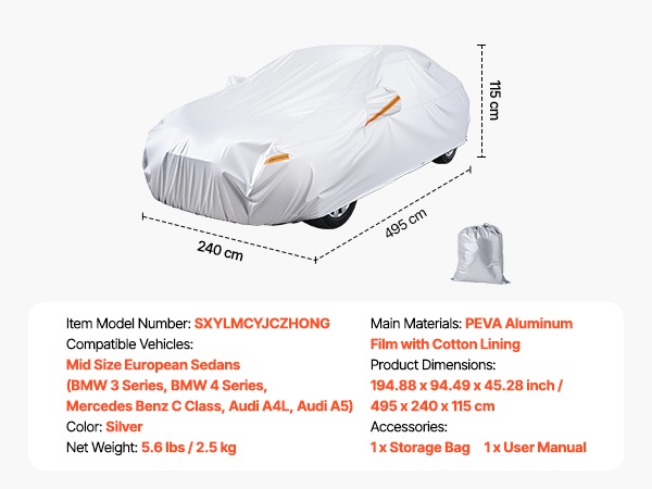 Tämä koko auton peittävä suojapeite on mitoitettu täyskokoisille eurooppalaisille sedan-malleille ja tarjoaa kestävän, tiukasti istuvan suojan. Vetoketjullinen oviaukko helpottaa käyttöä, ja heijastinnauhat sekä tuulenpitävät hihnat auttavat pitämään ajoneuvon suojassa vaativissakin sääolosuhteissa.