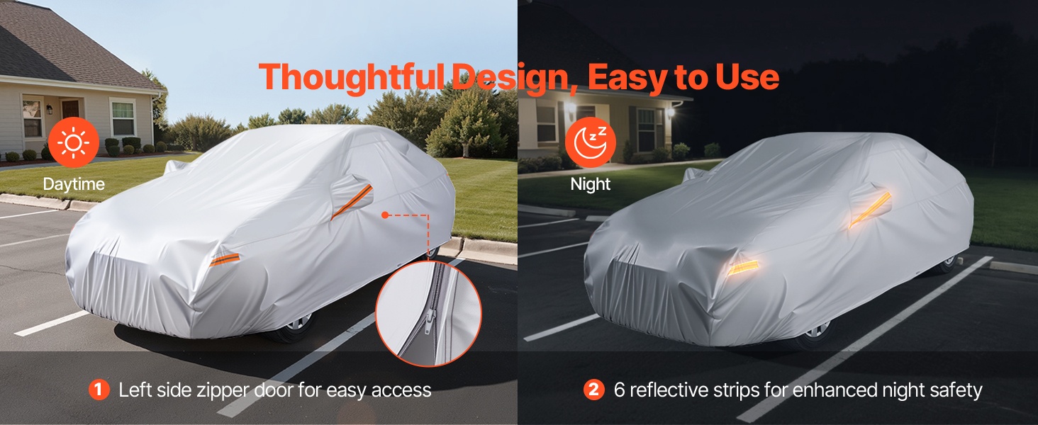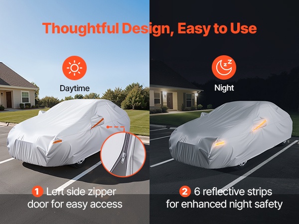Kätevän vasemman sivun vetoketjun ansiosta autoon pääsee sisään ilman, että peitettä tarvitsee irrottaa kokonaan. Kuusi heijastinnauhaa parantaa näkyvyyttä pimeällä, mikä lisää turvallisuutta sekä kuljettajalle että autolle.