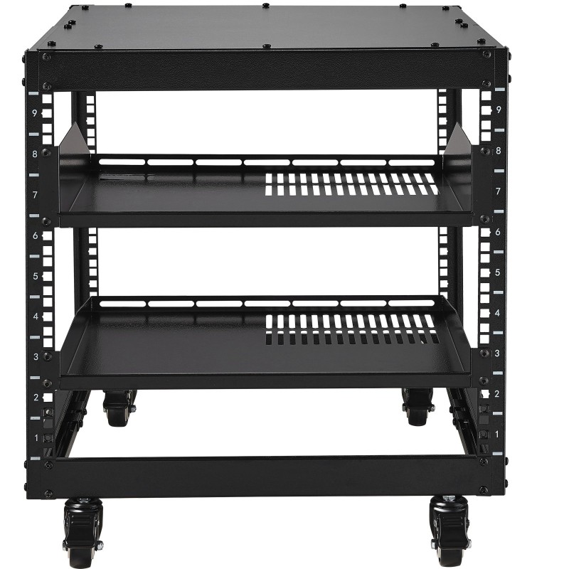 Tukeva teräsrunko ja korkea kantavuus tarjoavat luotettavan alustan verkkolaitteille, palvelimille ja AV-laitteille. Ylähylly tuo lisäsäilytystilaa ja suojaa laitteita, ja lukittuvat pyörät helpottavat telineen siirtämistä huoneesta tai työpisteestä toiseen.