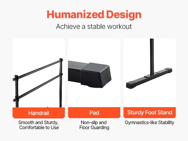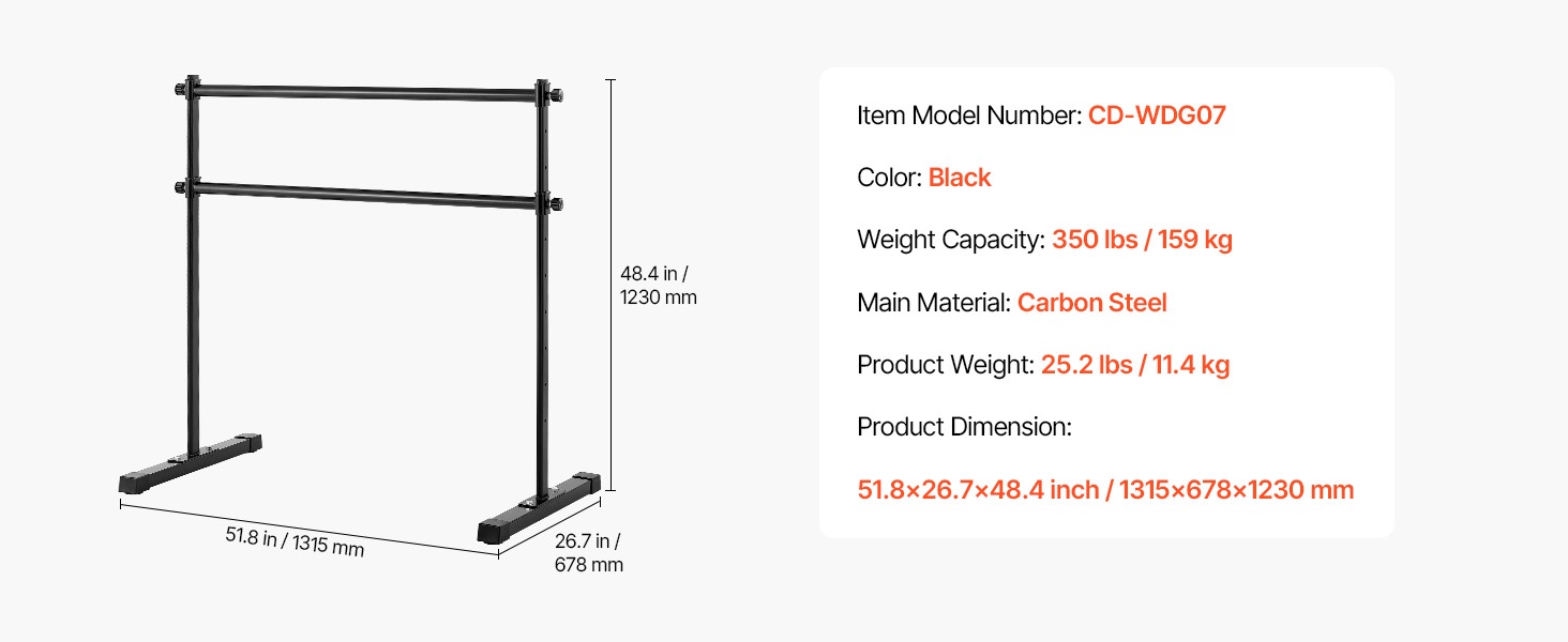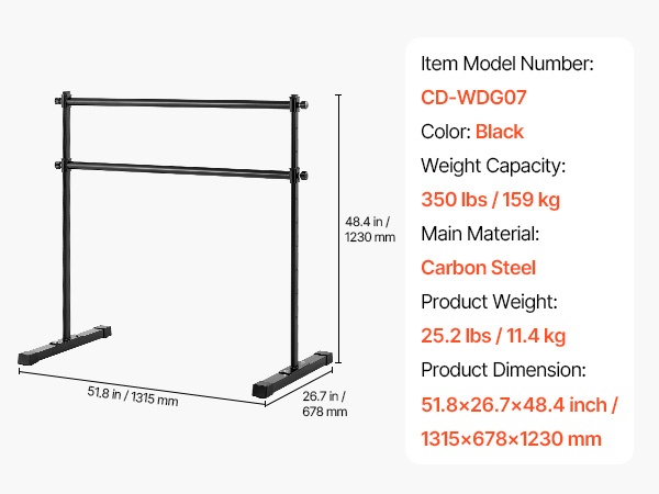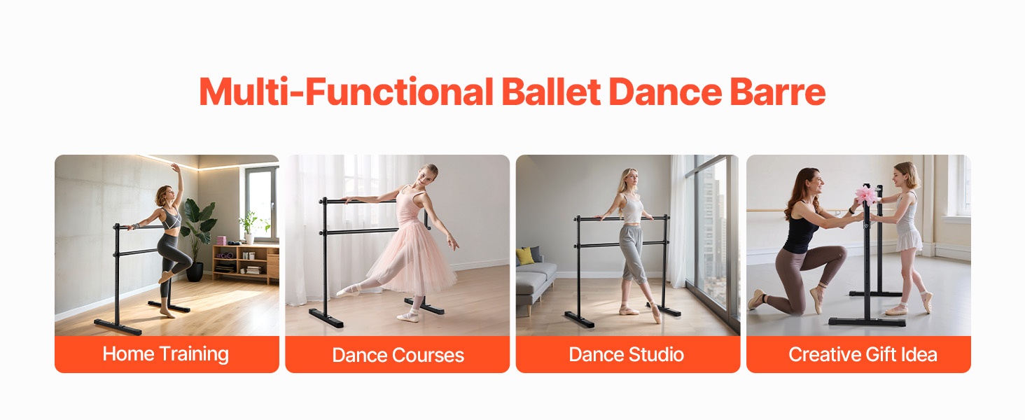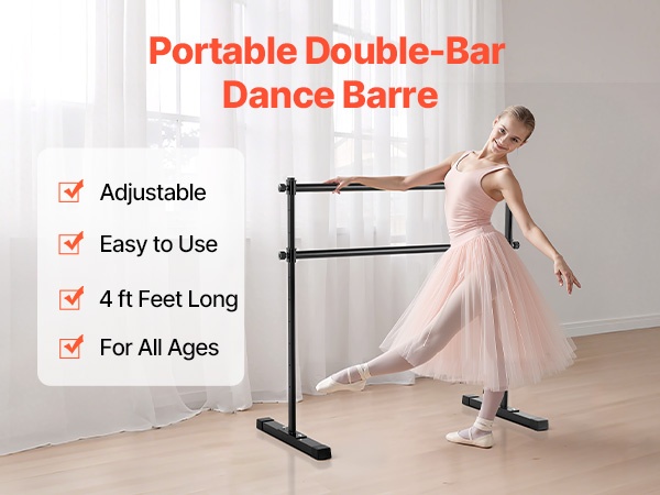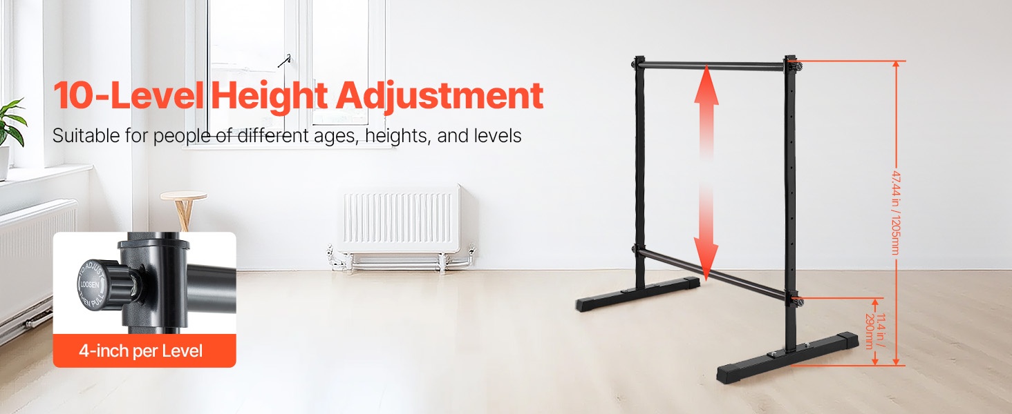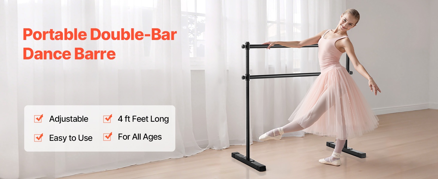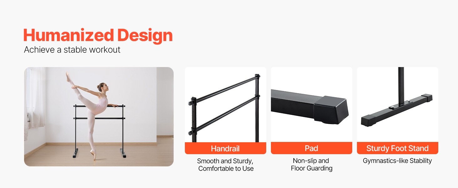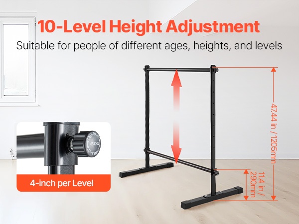 Korkeussäädettävässä balettitangossa on kaksi 6-foot-pituista puutankoa, joiden korkeus on säädettävissä ala-asennosta yläasentoon. Säädettävä korkeusväli: 6.7–46 inch / 170–1165 mm. Korkeutta voi muuttaa helposti kääntämällä säätönuppia, jotta tanko sopii eri harjoituksiin ja eri käyttäjille.