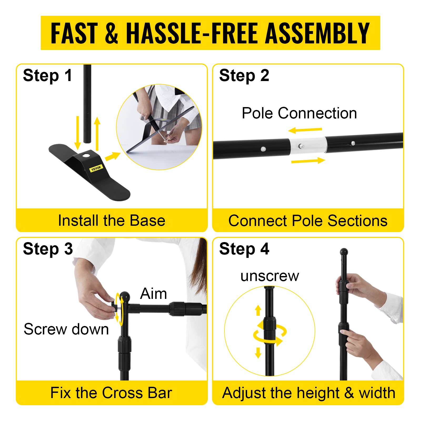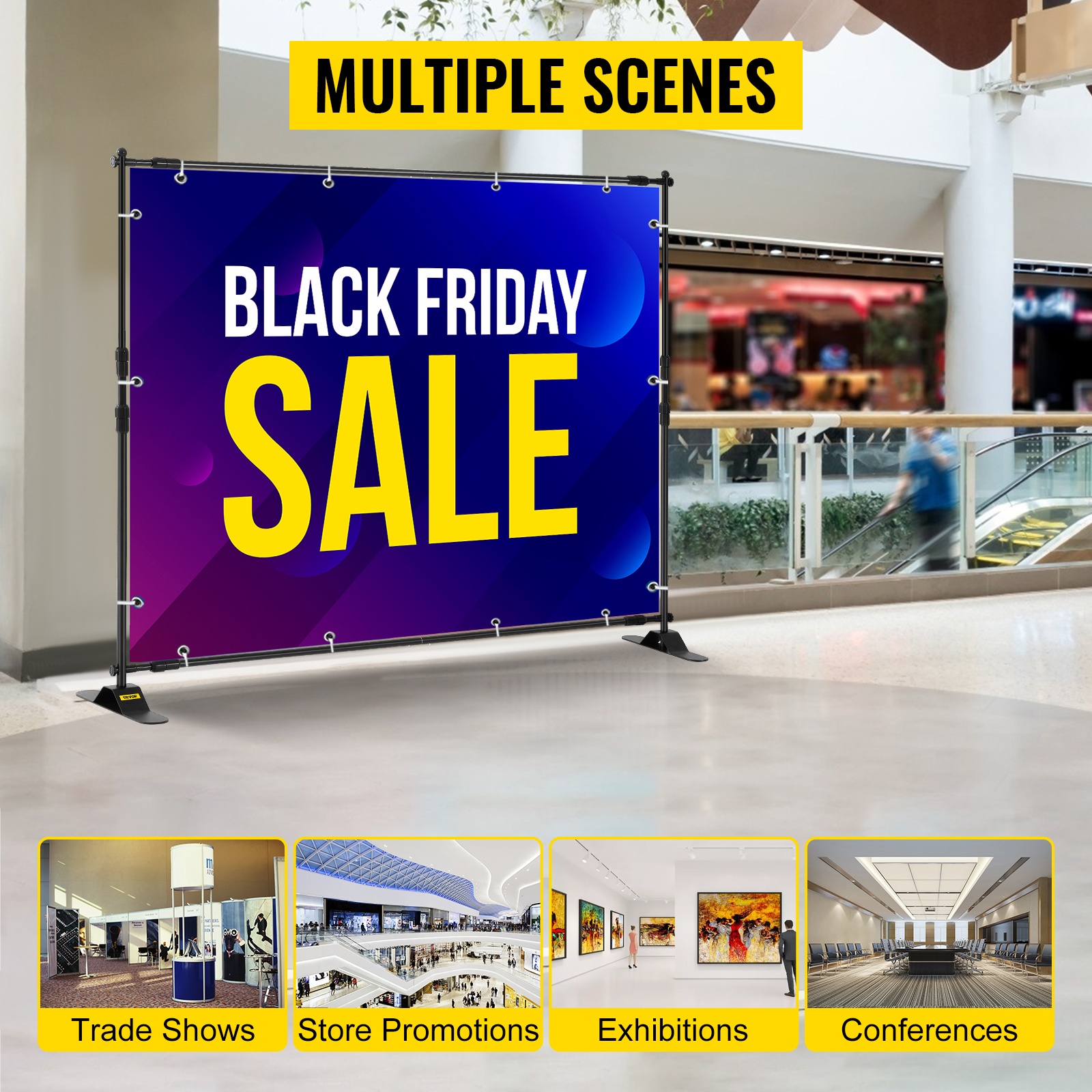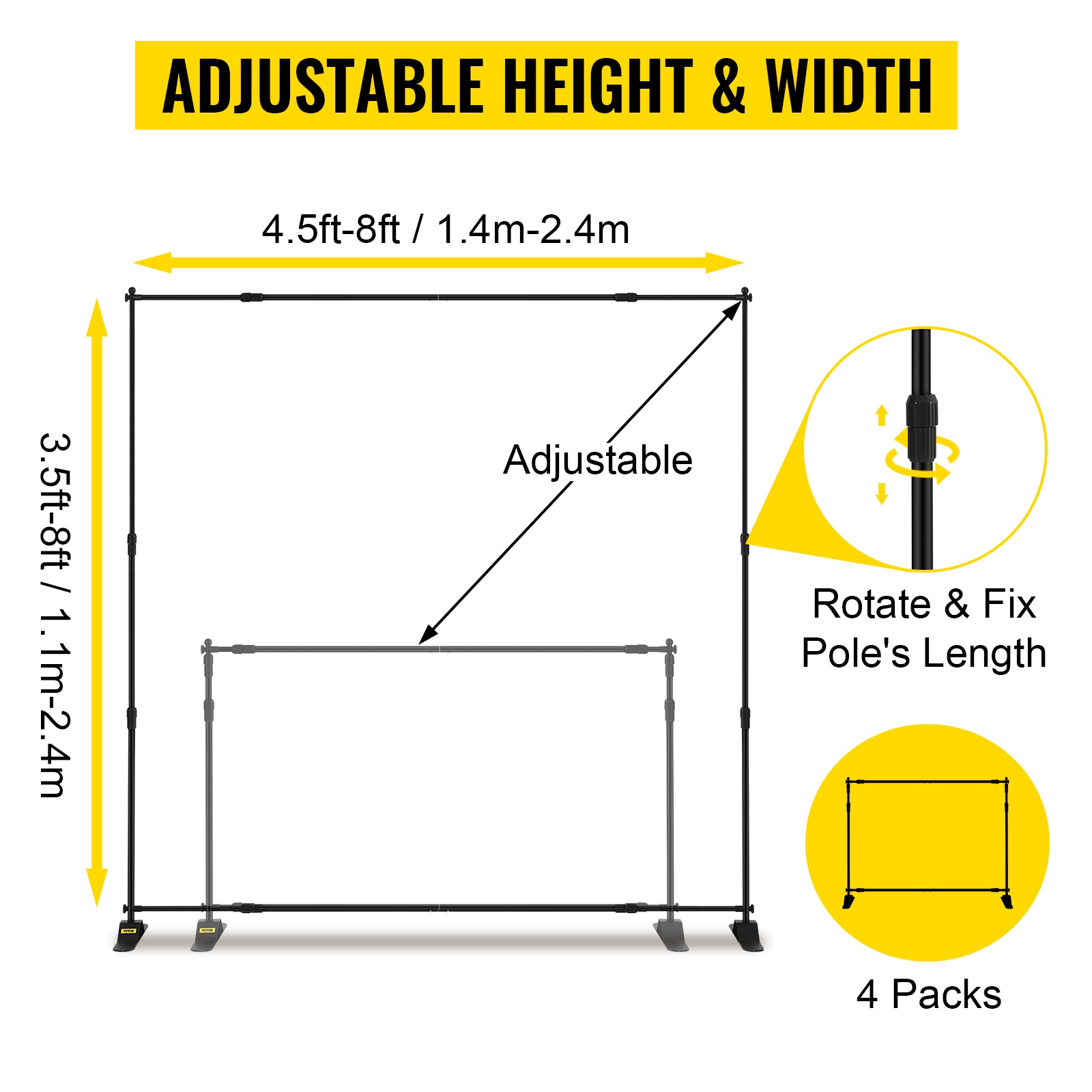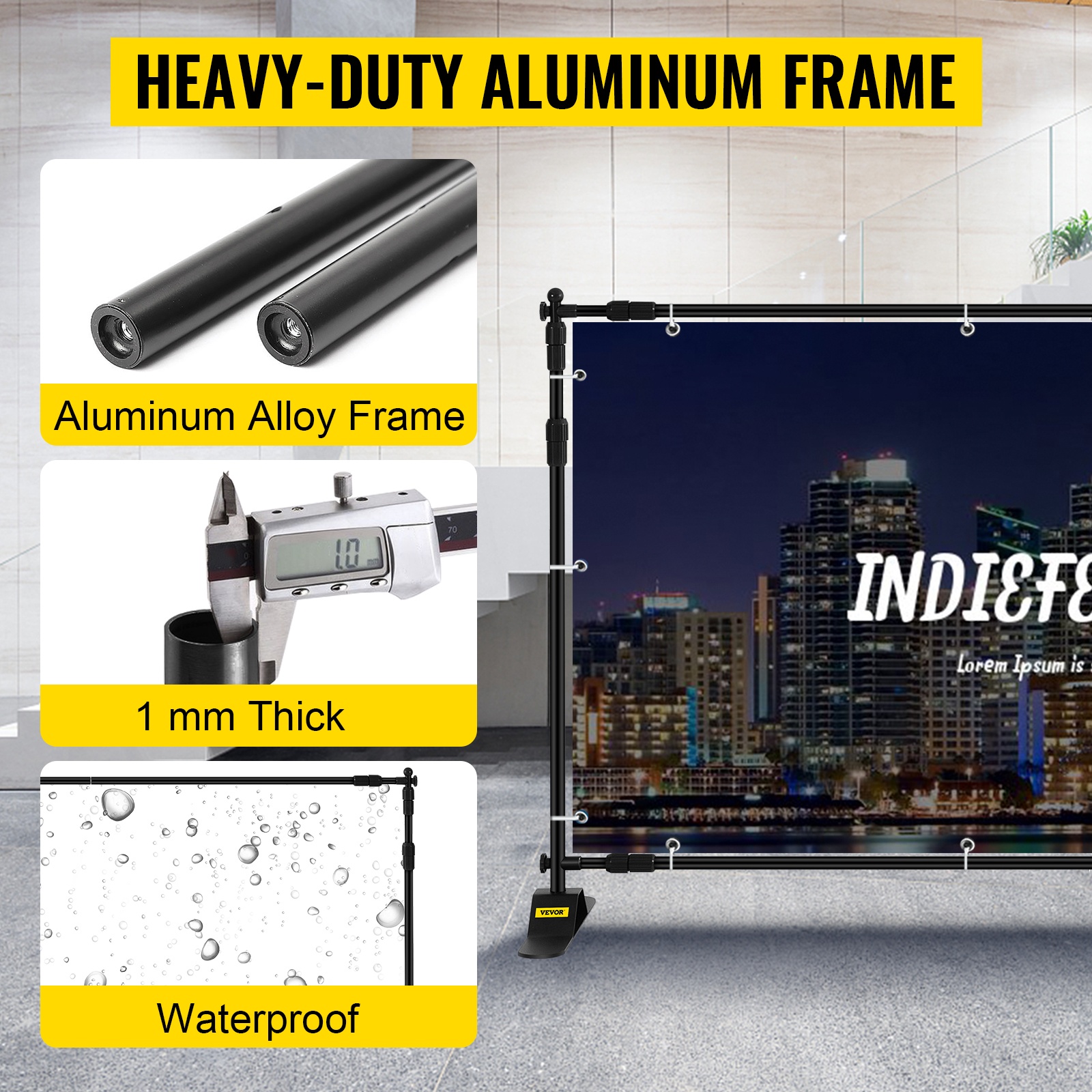 Telineen leveyttä ja korkeutta säädetään kiertämällä putkia haluttuun pituuteen. Se tukee bannerikokoja välillä 5.6 x 3.6 ft / 170 x 110 cm aina 10 x 8 ft / 300 x 240 cm asti.