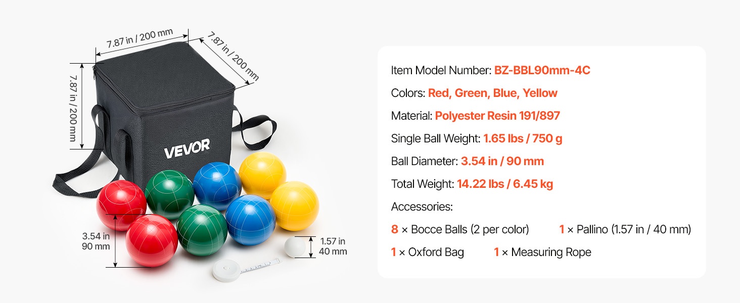 - Bocce-pallojen halkaisija: 3.94 in / 100 mm
