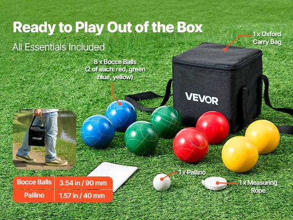 Setti sisältää 8 standardipalloa, 1 pallinon, mittausköyden ja tukevan kantolaukun. Näin peli on helppo käynnistää nopeasti ilman lisävarusteita.
