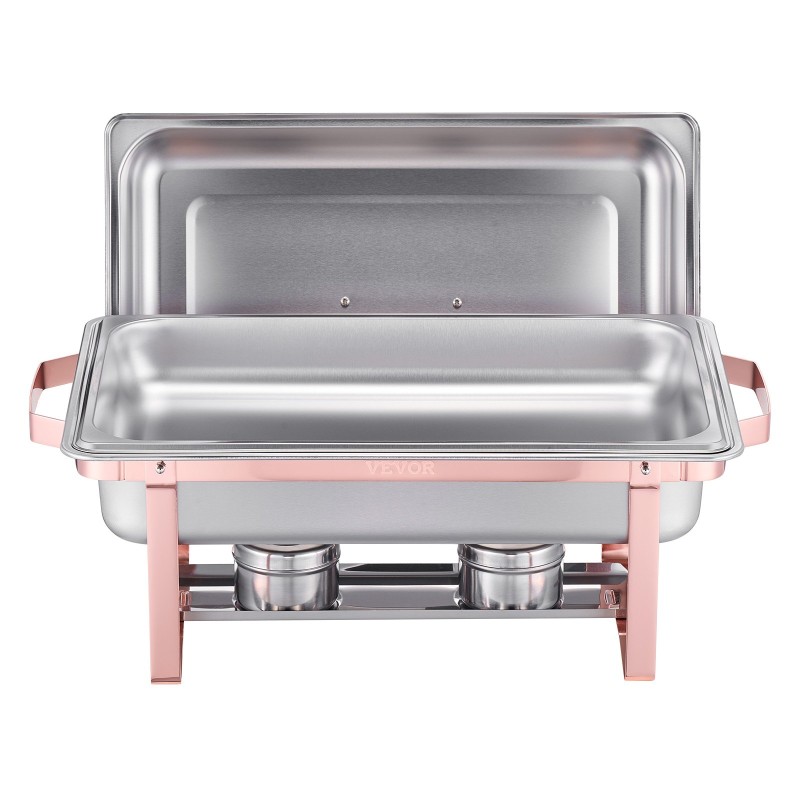 Ruostumattomasta teräksestä valmistettu buffet-tarjoilusetti, jossa on 2 suorakulmaista lämpöhaudetta. Kumpikin yksikkö sisältää kannen, vesialtaan, 2 täysikokoista ruoka-astiaa ja polttoainesäiliön. Soveltuu hyvin häihin, juhliin, buffet-tarjoiluun ja muihin tilaisuuksiin. Tyylikäs ruusukullan sävy viimeistelee kattauksen.