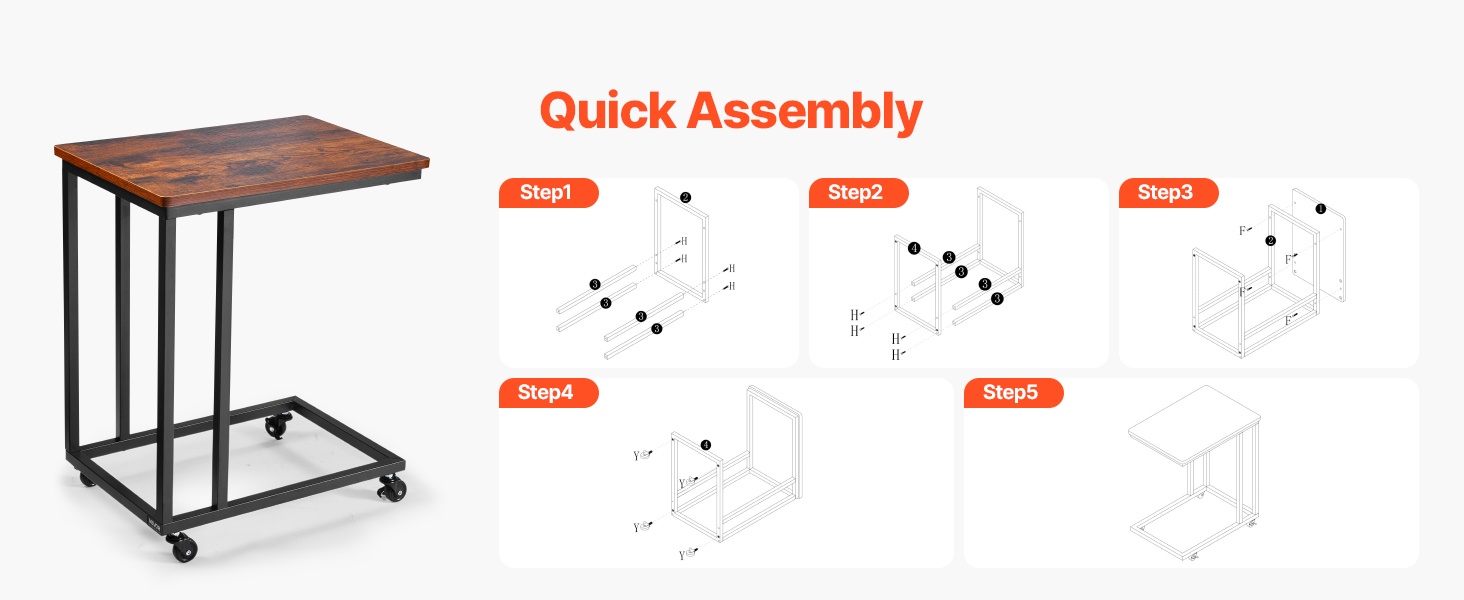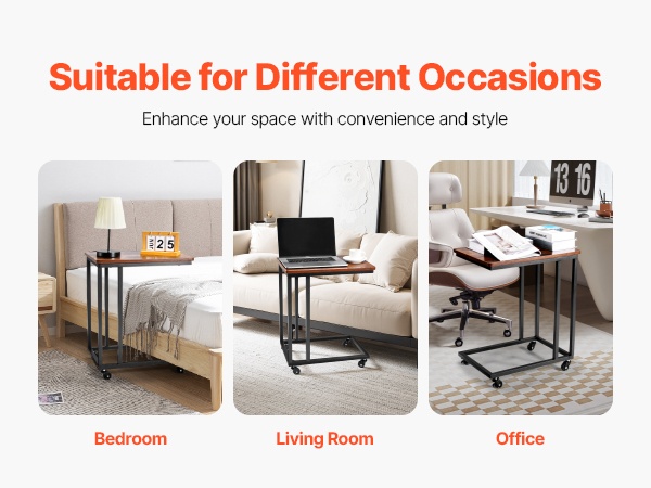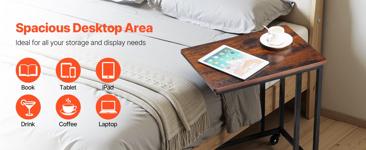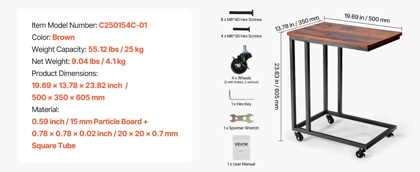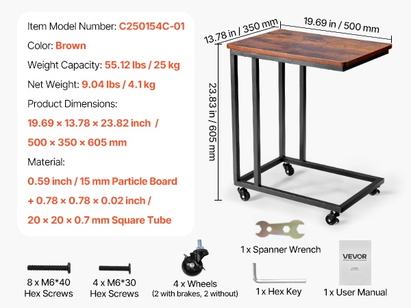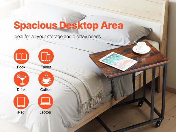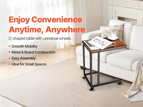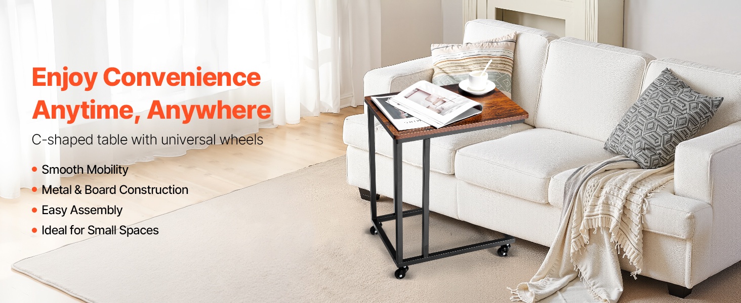 C-muotoinen taitettava sivupöytä mahtuu kätevästi sohvien ja sänkyjen alle ja säästää tilaa. Pöydän mitat ovat 23.62 x 14.57 x 27.56 inch / 600 x 370 x 700 mm. Taitettava rakenne helpottaa säilytystä, ja säädettävät jalat suojaavat lattiaa. Vankka metallirunko ja paksu lastulevykansi kestävät jopa 30.86 lbs / 14 kg. Yksinkertainen kokoaminen sopii mihin tahansa huoneeseen.