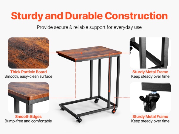 Taitettava C-muotoinen sivupöytä käyttää tukevaa rautarunkoa vakauden varmistamiseksi. Paksu lastulevykansi on helppo puhdistaa ja suunniteltu kestämään käyttöä. Säädettävät jalat suojaavat lattiaa ja auttavat pitämään pöydän suorassa, ja ylä- ja alaosan tukiosat lisäävät kestävyyttä ja auttavat estämään tavaroiden putoamista.