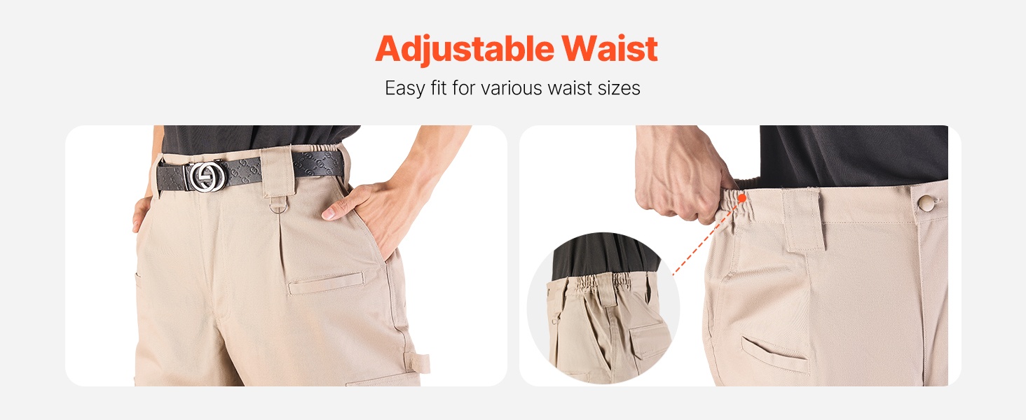 Housuissa on kaksinkertainen vyötärörakenne: joustava kuminauhavyötärö sekä vyölenkit. Tämä helpottaa istuvuuden säätämistä eri vartalotyypeille ja vyötärönympäryksille. Voit käyttää housuja pelkän joustovyötärön varassa tai yhdessä vyön kanssa lisätuen saamiseksi.