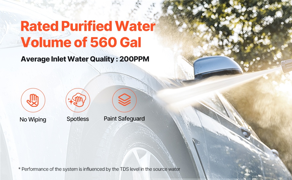 Autonpesujärjestelmä toimii tehokkaasti ja tasaisella vedenvirtauksella, tarjoten nimelliskapasiteetin 560 gallons (2120L). Se tuottaa puhdasta deionisoitua vettä, joka mahdollistaa tahrattoman ja raidattoman pesutuloksen, vähentää kuivauksen tarvetta ja auttaa suojaamaan auton maalipintaa.