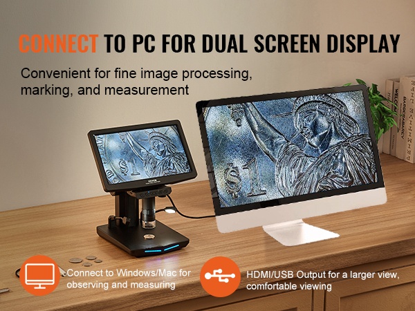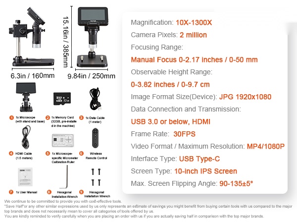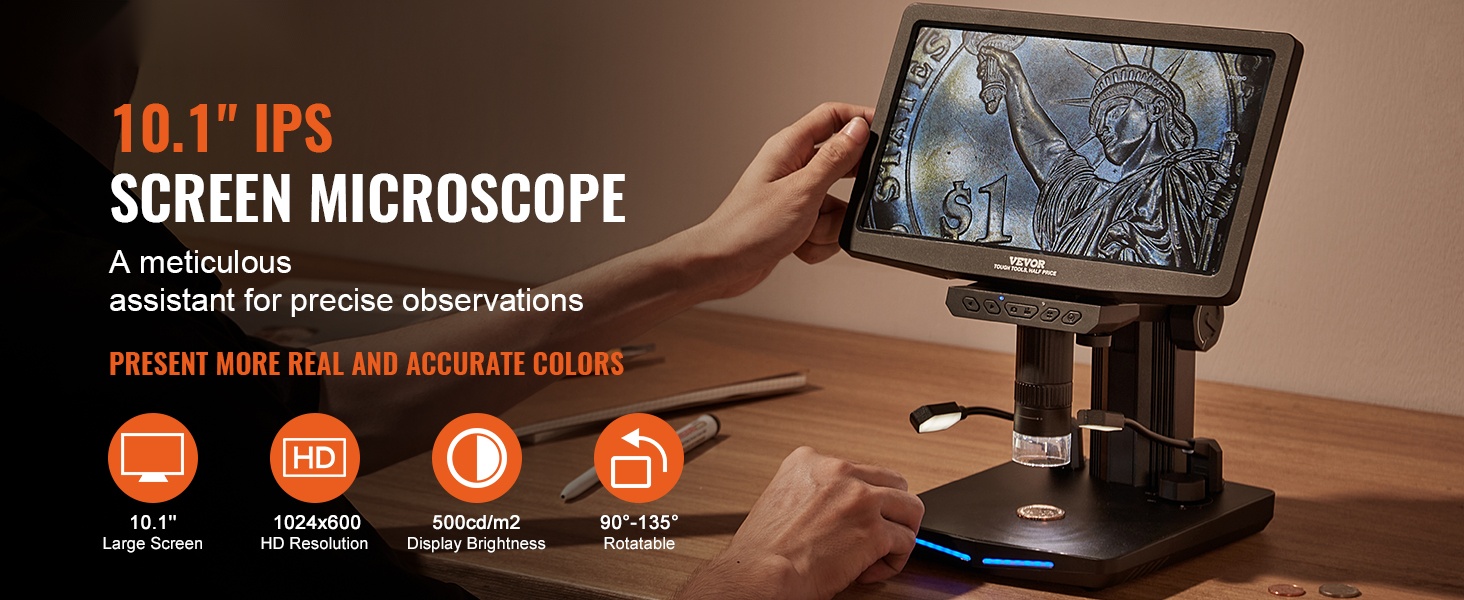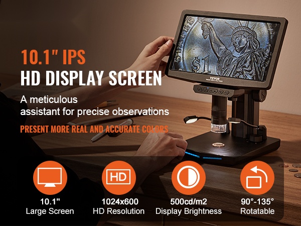 Tämä digitaalinen mikroskooppi tarjoaa tarkan näkymän pienimpiinkin yksityiskohtiin. 25.7 cm IPS-näyttö (10.1-tuumainen) helpottaa näytteiden tarkastelua, kuvien säätöä ja havainnoinnin jakamista. Näyttöä voi kallistaa, jolloin katselukulma on helppo säätää miellyttäväksi pitkissäkin työskentelyjaksoissa.