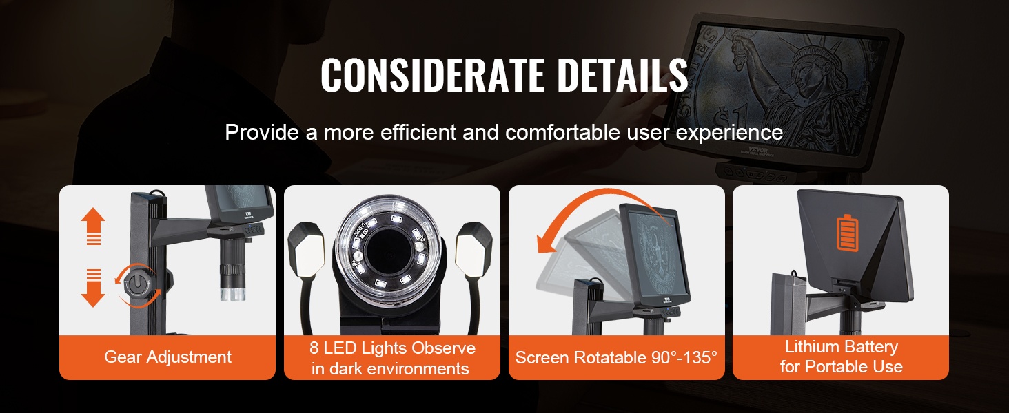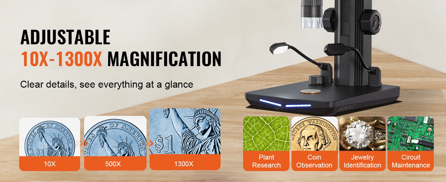 - 10X–1300X suurennusalue kolikkojen, kasvien, korujen ja pienten komponenttien tarkkaan tutkimiseen.