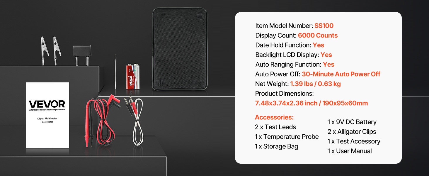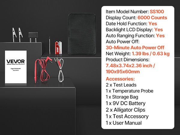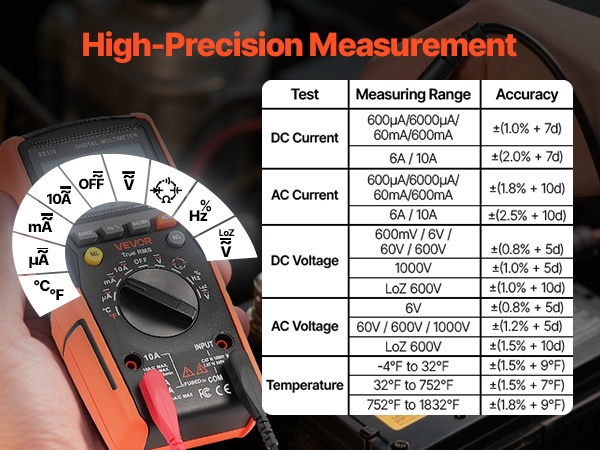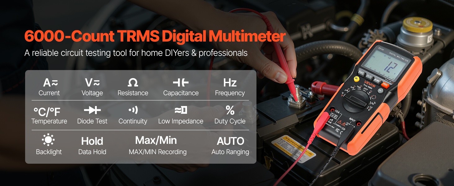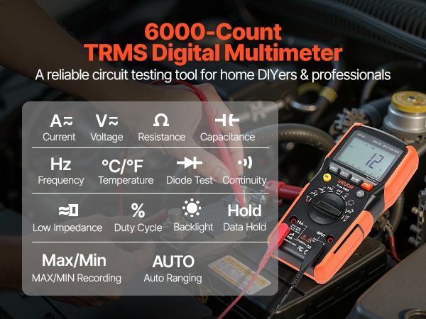 Tämä 6000-count TRMS -digitaalinen yleismittari tukee virran, jännitteen, resistanssin, kapasitanssin, taajuuden, lämpötilan, diodien, jatkuvuuden ja käyttöasteen mittausta. True RMS -tekniikka ja kosketukseton jännitetunnistus (NCV) auttavat tekemään mittauksista tarkkoja ja turvallisia niin kotona kuin ammattikäytössä.