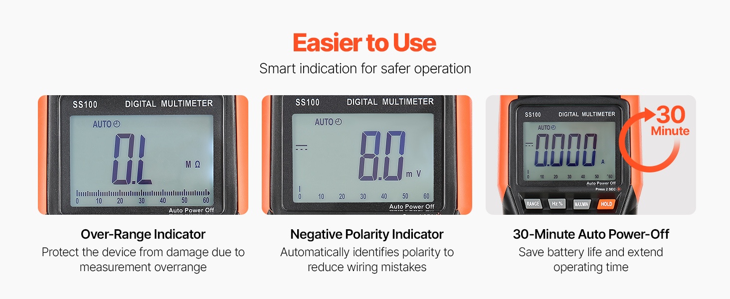 Analoginen palkkigrafiikka, negatiivisen napaisuuden osoitus ja ylivuotoilmaisin tekevät mittaustulosten tulkinnasta selkeää. Tietojen pito sekä maksimi- ja minimiarvon tallennus helpottavat arvojen vertailua. Taustavalaistu LCD-näyttö parantaa luettavuutta, ja pariston alhaisen varauksen ilmaisin muistuttaa ajoissa pariston vaihdosta.