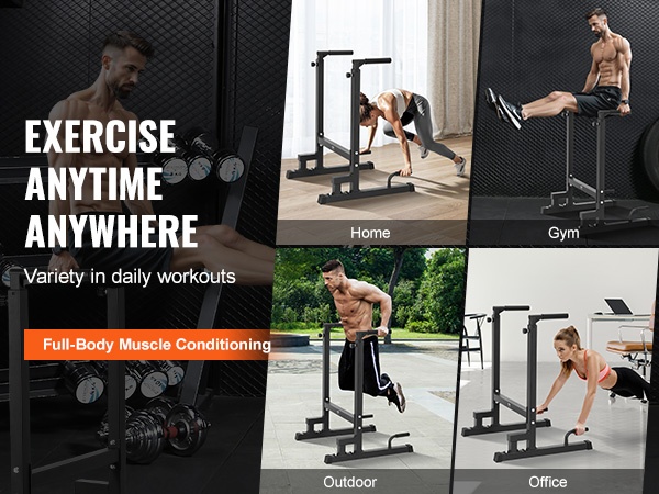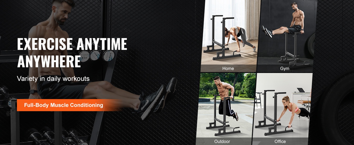 Liikuteltava dip-teline sopii moniin kehonpainoharjoituksiin, kuten dippeihin, punnerruksiin, jalkojen nostoihin ja erilaisiin keskivartaloliikkeisiin. Samalla välineellä voi harjoittaa rintaa, olkapäitä, käsivarsia, selkää ja keskivartaloa.