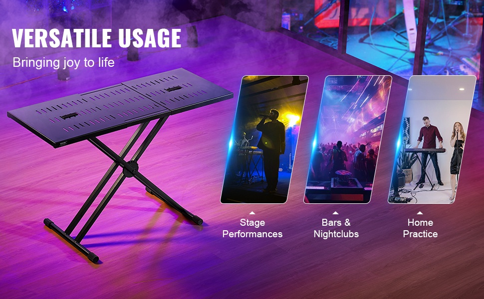 Säädettävän korkeuden ansiosta telineen voi mukauttaa erilaisiin käyttötapoihin ja esiintymislavoihin – olitpa sitten seisten tai istuen. Tukeva runko ja lukitusmekanismi vähentävät heilumista käytön aikana.