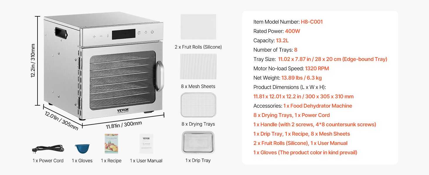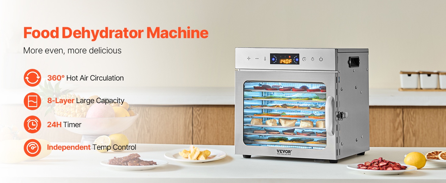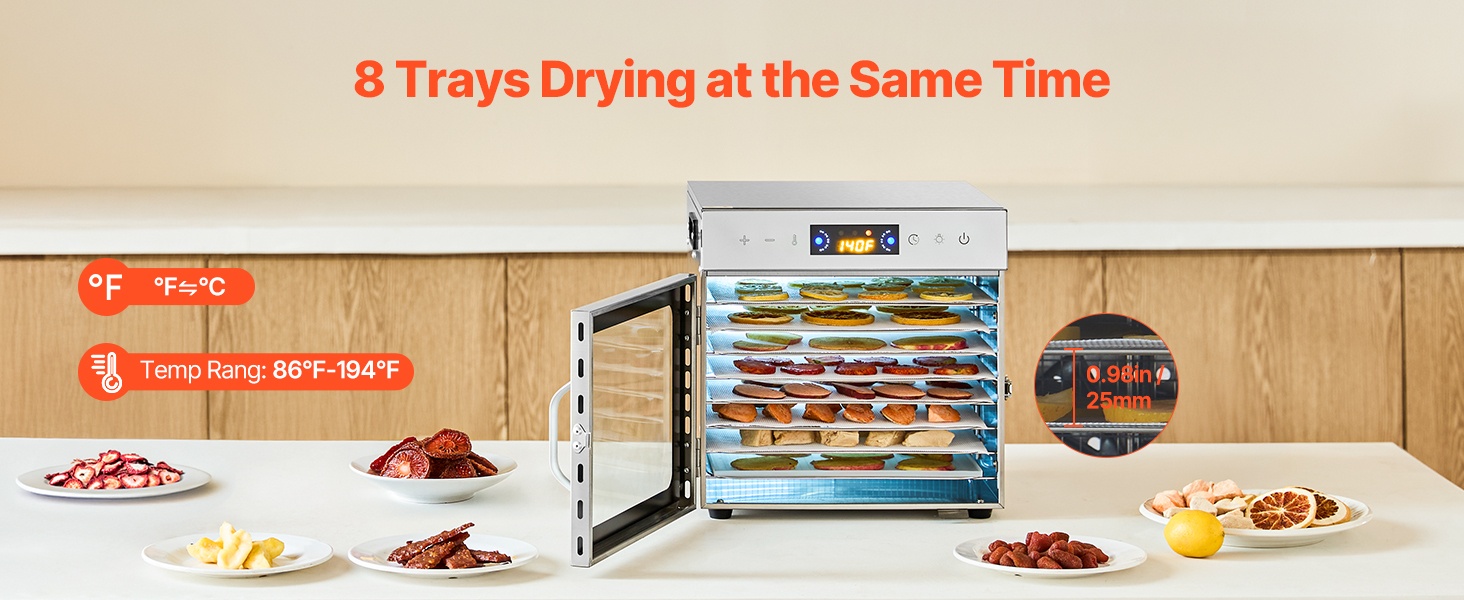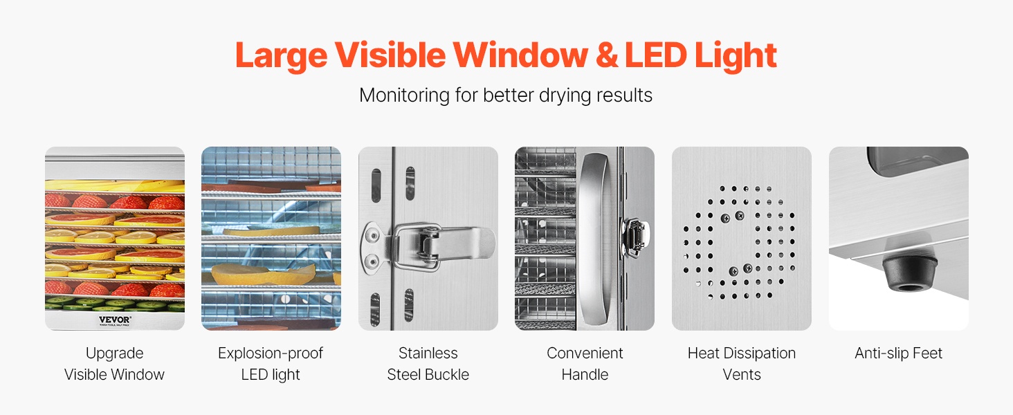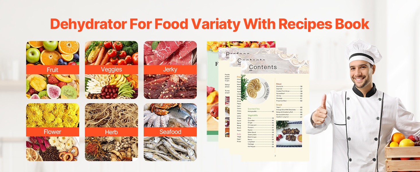 10 kerroksesta koostuva kuivauskone sopii erilaisten raaka‑aineiden kuivaamiseen: hedelmät, vihannekset, liha ja jerky, yrtit, kala ja äyriäiset, viljat sekä koirien herkut. Mukana tuleva resepti auttaa valmistamaan helposti monenlaisia kotitekoisia, kuivatettuja ruokia.