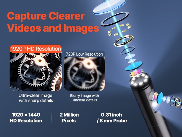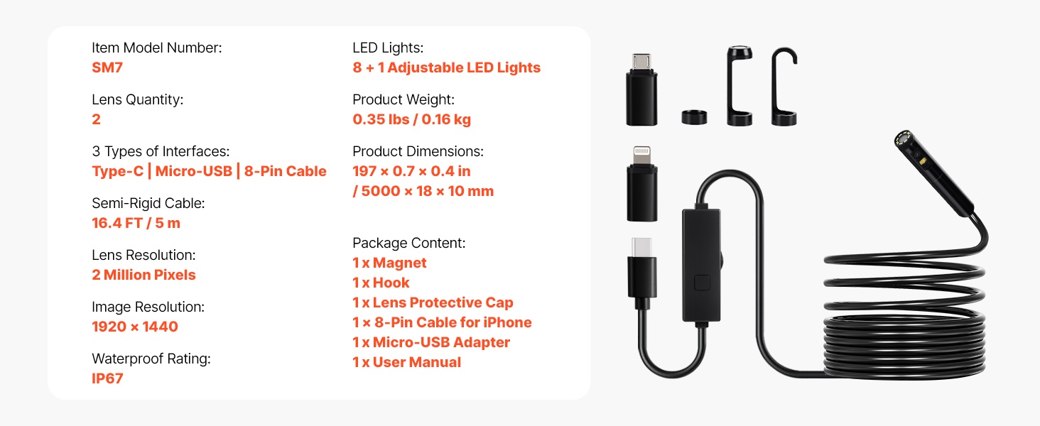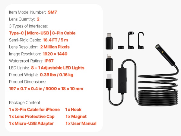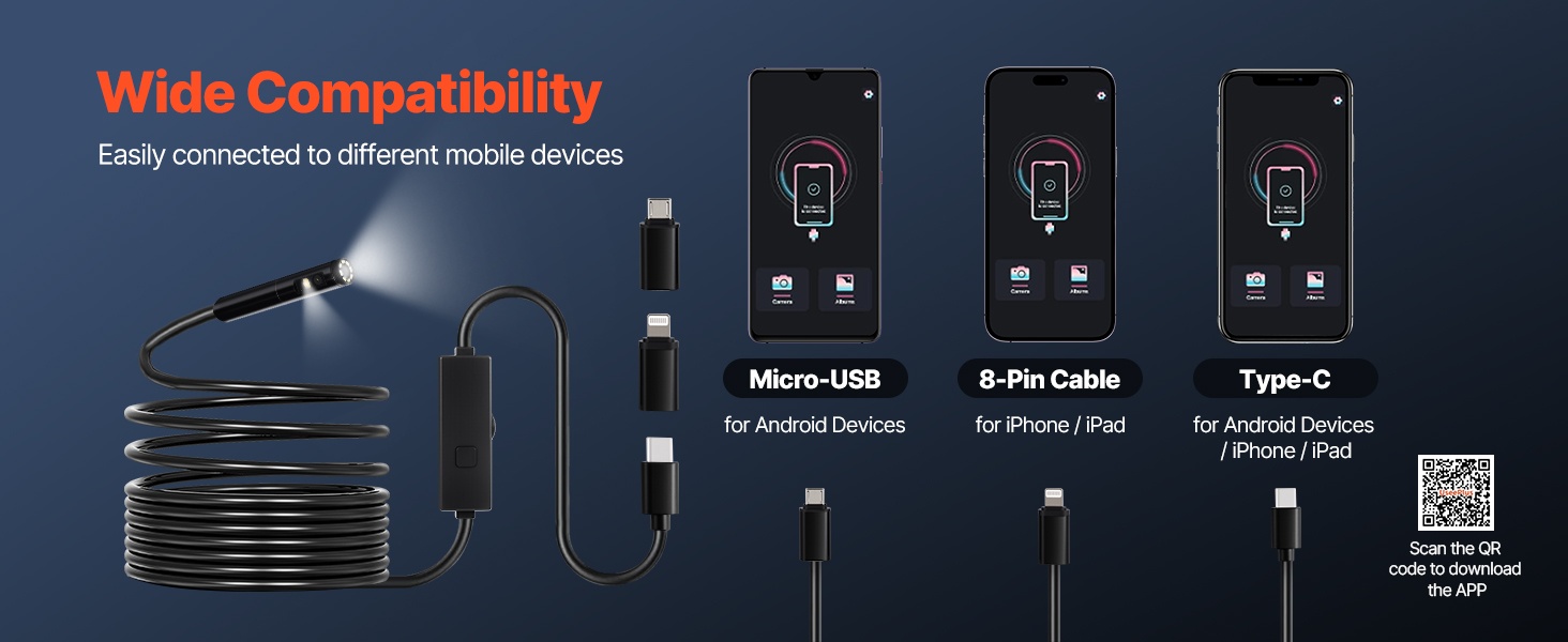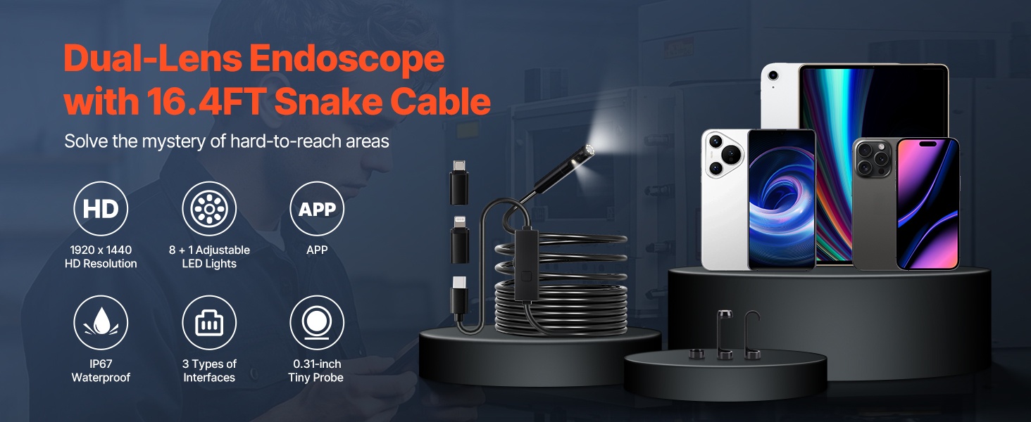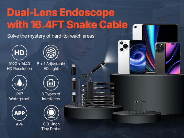 3 m puolijäykällä kaapelilla varustettu endoskooppikamera helpottaa tarkkoja tarkastuksia paikoissa, joihin on muuten vaikea päästä käsiksi. Mukana tulevat 8-Pin-, Type-C- ja Micro-USB -sovittimet tekevät käytöstä joustavaa iOS 9+ -laitteiden ja OTG-yhteensopivien Android 6+ -laitteiden kanssa. Soveltuu esimerkiksi autojen moottoreiden, viemäriputkien ja ilmanvaihtokanavien tarkastuksiin.