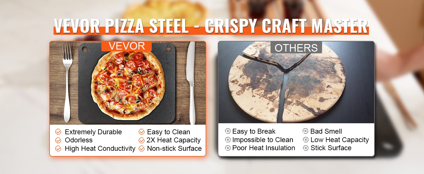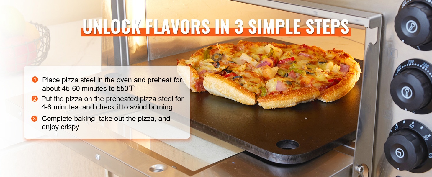 16" x 14.5" x 1/4" pizzateräslevy tarjoaa tasaisen ja tehokkaan lämmönjaon. Teräs johtaa lämpöä jopa 20 kertaa paremmin kuin keraamiset kivet, mikä auttaa saamaan rapean pohjan ja kypsän täytteen sekä kotiuunissa että ulkogrillissä.