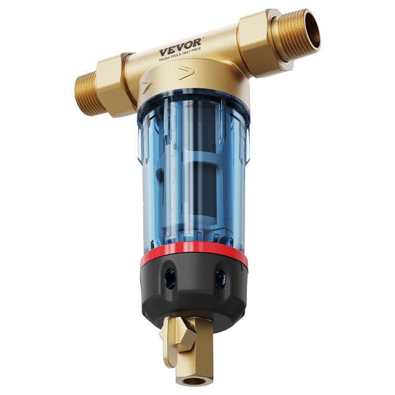 Esisuodatin asennetaan tulovesiputkeen, ja se sopii useisiin liitinkokoihin: 3/4" G-M, 1" G-M ja 3/4" G-F. Asennus ei vaadi sähköä tai lattiakaivoa – riittää, että suodatin kiinnitetään putkiston tulo- ja lähtöpäähän ja tyhjennysmahdollisuus järjestetään takahuuhtelua varten.