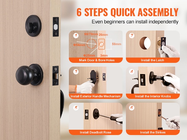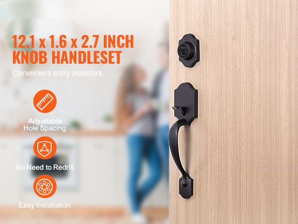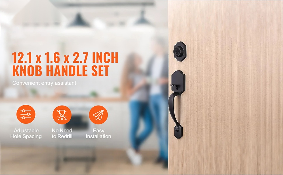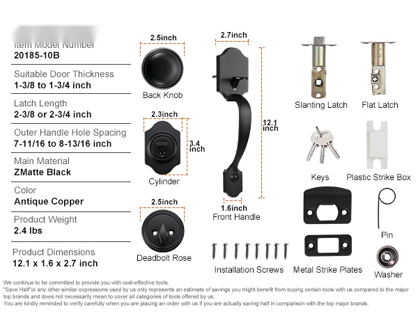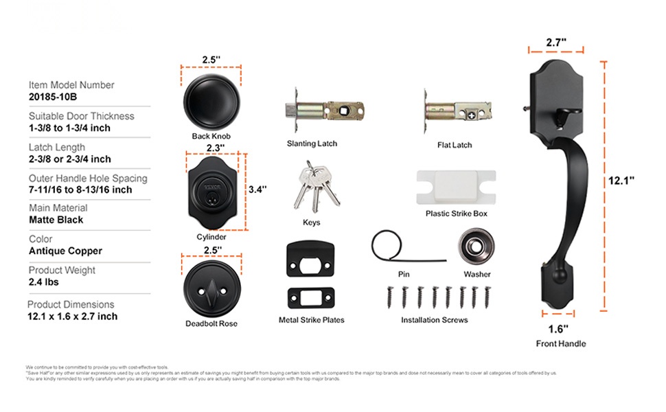 Tämä etuoven lukitussetti varmuuslukolla on mitoiltaan 11.2 tuumaa (pituus) x 3.9 tuumaa (leveys) x 6.1 tuumaa (korkeus). Ulkokahvan reikien väli on säädettävissä välillä 7-11/16 – 8-13/16 tuumaa (195-224 mm), joten lukon paikkaa voidaan hienosäätää ilman uusia porauksia.