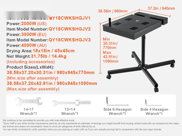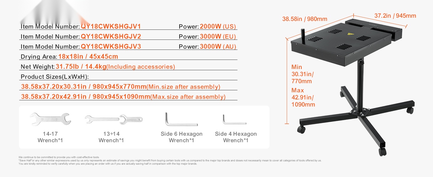 Kaksi säädettävää korkeutta helpottaa laitteen sovittamista eri kokoisiin työtasoihin ja tekstiileihin. Kuivain kovettaa silkkipainovärit nopeasti, mikä nopeuttaa värinvaihtoja ja tekee siitä käytännöllisen työkalun koko painatusprosessiin.