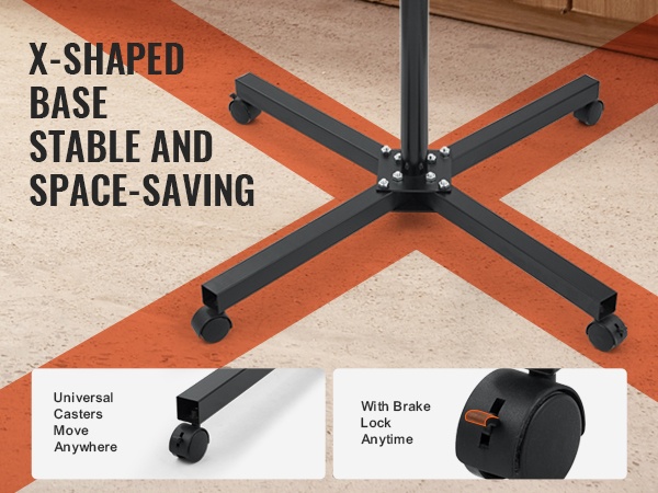 Erityisen vakaa X-muotoinen jalusta pitää laitteen tukevasti paikoillaan käytön aikana. Neljä kääntyvää pyörää jarruilla mahdollistavat sekä kiinteän että liikuteltavan käytön työtilassa.