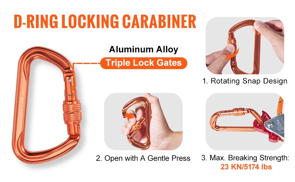 Karabiini tukee ja vakauttaa kiipeilyä murtolujuudellaan 23 KN/5174 lbs. Siinä on 3-tapainen lukitusmekanismi, joka mahdollistaa nopean lukittumisen ja helpon yhden käden avauksen.
