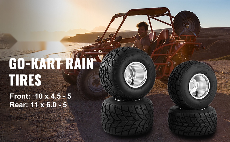 - Täydellinen yhdistelmä: 2 eturengasta 10X4.5-5 ja 2 takarengasta 11X6.0-5 karting-käyttöön.