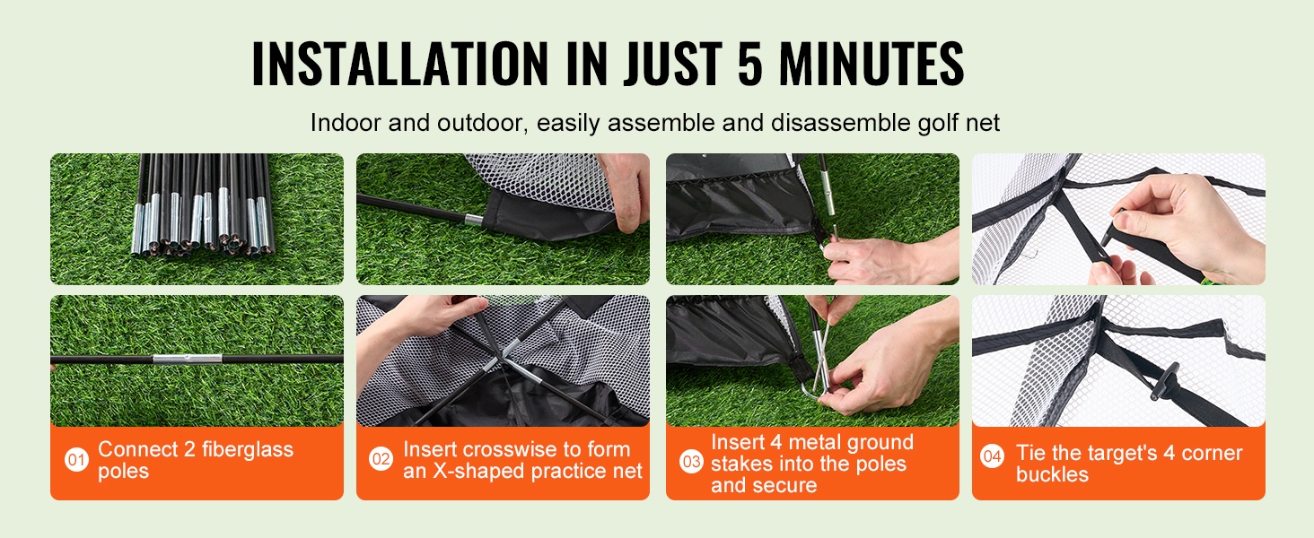 Harjoitus- ja chippausharjoitusverkon putkissa on järjestyksessä olevat merkinnät, joiden avulla kokoaminen ja purkaminen on vaivatonta. Rakenne on suunniteltu siten, että pystytys vie noin 5 minuuttia eikä vie liikaa vapaa-aikaasi.