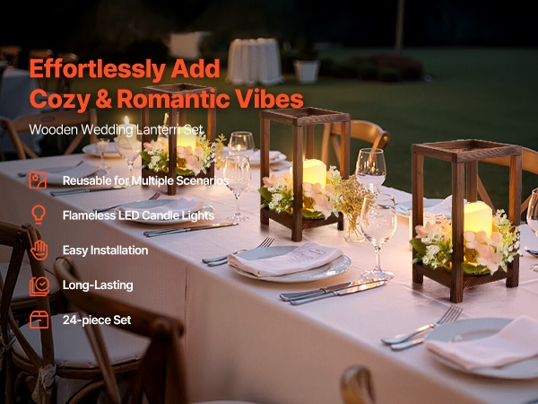 Tämä puinen häälyhtypaketti sisältää kaiken tarvittavan yhtenäisen ja tunnelmallisen kattauksen luomiseen. Setissä on yhteensä 30 osaa: puiset lyhdyt, liekittömät LED-kynttilät ja samppanjansävyiset kukkaseppeleet, jotka sopivat juhlapöytiin, farmhouse-tyyliseen sisustukseen ja erilaisiin juhliin.