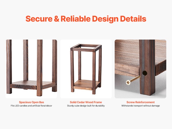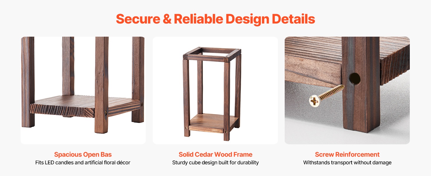 Lyhty on valmistettu tukevasta setripuusta, ja vahvistetut ruuvit auttavat kestämään siirtoja ja kolhuja. Mukana tuleva hienostunut, keinotekoinen samppanjansävyinen kukkaseppele lisää koristeellisuutta. Liekittömät LED-kynttilät tekevät lyhdyistä turvallisen ja luotettavan valinnan sisäkäyttöön.
