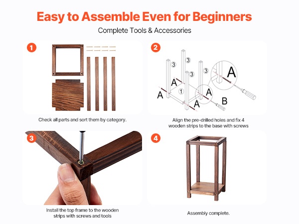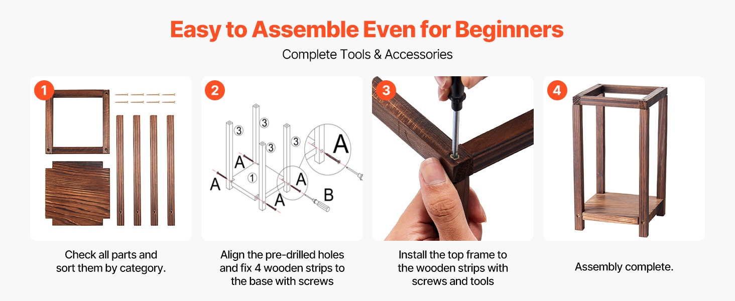 Puiset lyhdyt toimitetaan yhteensopivien ruuvien, työkalujen ja yksityiskohtaisen, kuvituksen sisältävän käyttöohjeen kanssa. Kokoaminen on selkeää eikä vaadi lisätyökaluja. Myös ensikertalainen saa lyhdyt koottua ja aseteltua helposti.