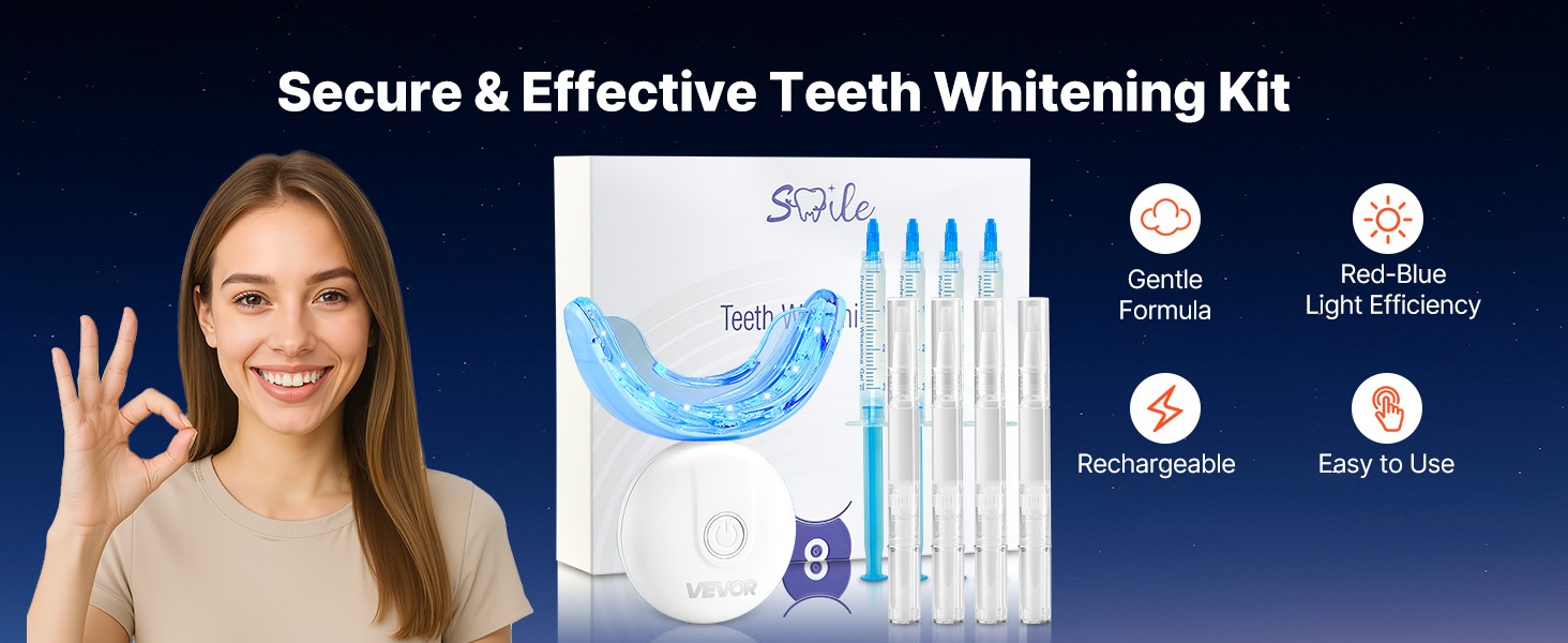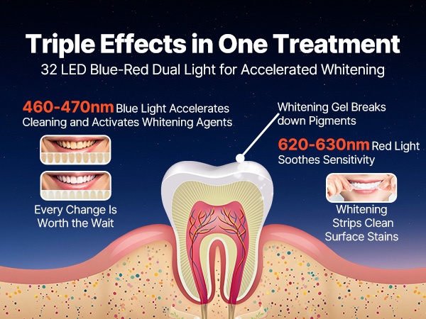 Punaiset ja siniset LED-valot toimivat yhdessä nopeuttaen valkaisuprosessia. Yhdistettynä mietoon geelikaavaan tämä LED-hampaiden valkaisusetti auttaa vähentämään värjäytymiä ja kellastumia ilman voimakkaita liuskoja tai epämiellyttäviä käsittelyjä.