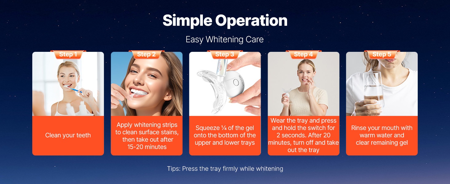 Selkeä 5-vaiheinen rutiini tekee käytöstä yksinkertaista. Pitkä painallus käynnistää valkaisulaitteen, ja voit aloittaa hymyä kirkastavan käsittelyn kotona ilman hammaslääkärikäyntiä.