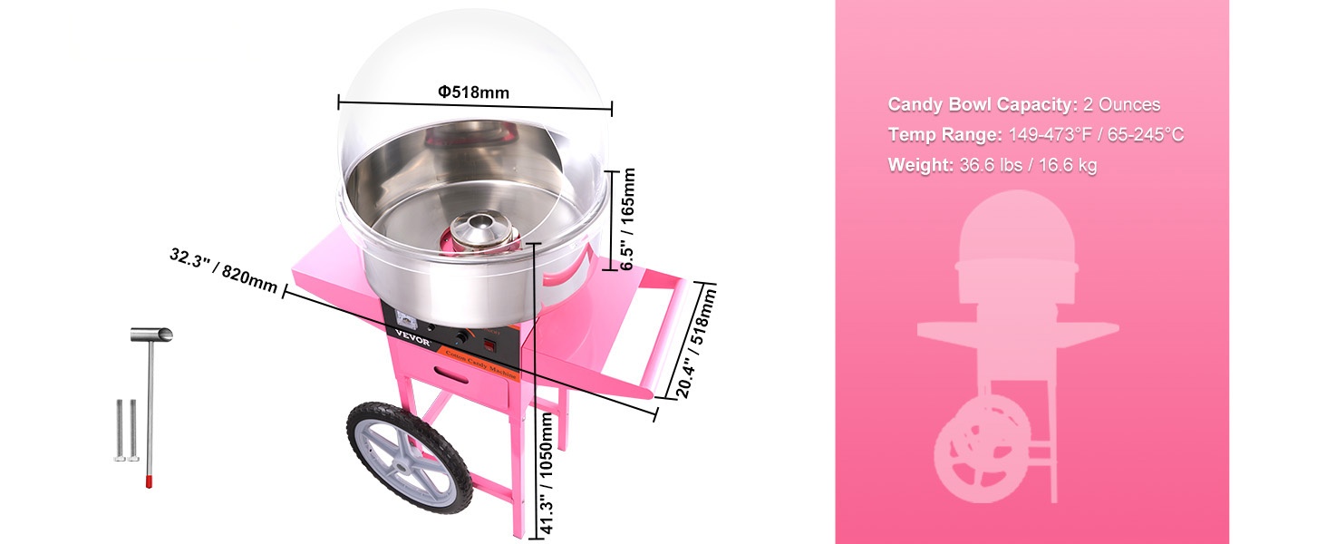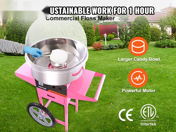 Tässä hattarakoneessa on 1000W moottori ja suuri hattarakulho, joiden ansiosta se tuottaa noin 6 hattaraa minuutissa. Laite voi toimia yhtäjaksoisesti noin 1 tunnin, joten se sopii hyvin erilaisiin juhliin ja tapahtumiin. Kone soveltuu useimmille sokerityypeille, myös maustetuille ja värjätyille sokereille.