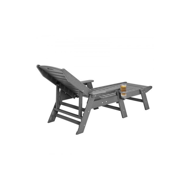 Tilava, sään- ja UV-kestävä HDPE-lepotuoli (185 cm), kantavuus 450 lb. Kuusi säädintä, leveät käsinojat, kääntyvä mukiteline, helppo puhdistaa ja koota.