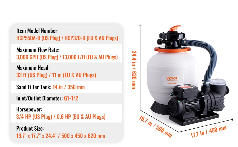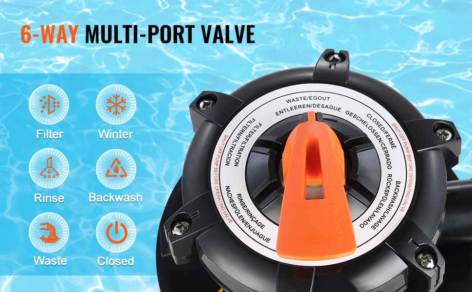 Pumppu tarjoaa 13,000 L/H virtausnopeuden ja hyödyntää 350 mm termoplastista hiekkasuodatinsäiliötä. 6-asentoinen monitieventtiili helpottaa käyttöä ja tekee järjestelmästä monipuolisen. Pumppu auttaa pitämään altaan veden puhtaana ja tasalaatuisena sekä kotikäytössä että kevyessä ammattikäytössä.