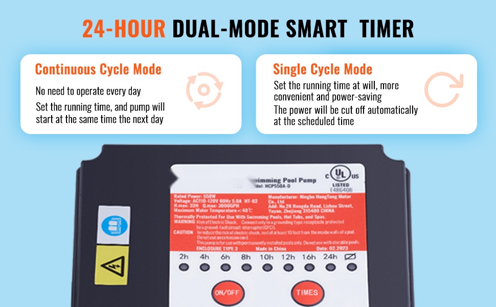 Hiekkasuodatinpumppu on varustettu kuparikäämitetyllä moottorilla, jonka pyörimisnopeus on 2,860 RPM. IPX5-suojausluokka ja CLASS F -eristys lisäävät käyttöturvallisuutta ja kestävyyttä. Kaksinkertainen ylikuormitus- ja ylikuumenemissuoja auttaa varmistamaan pitkäikäisen ja luotettavan toiminnan.
