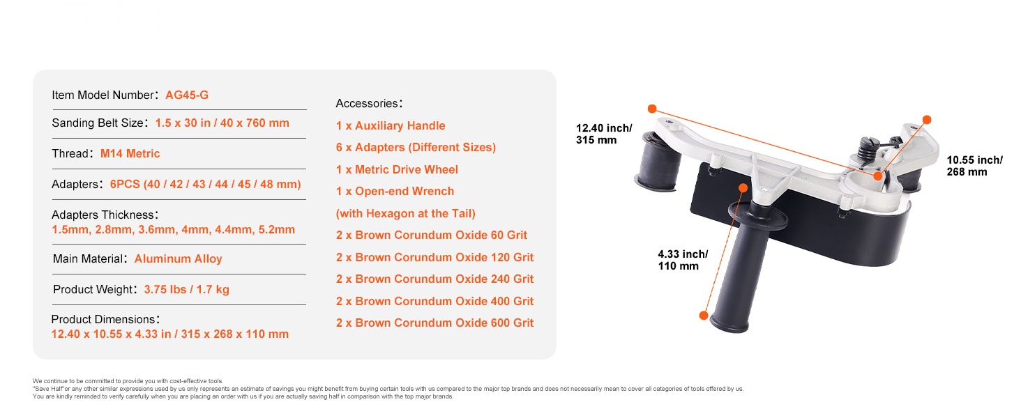Putkien ja putkimaisten kappaleiden hiomasovitin on valmistettu korkealaatuisesta alumiiniseoksesta, joka kestää ruostetta, korroosiota ja naarmuuntumista. Integroitu alumiinirunko auttaa pitämään hiomanauhan paikoillaan myös painetta käytettäessä.