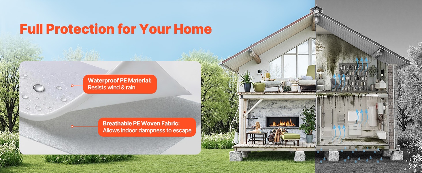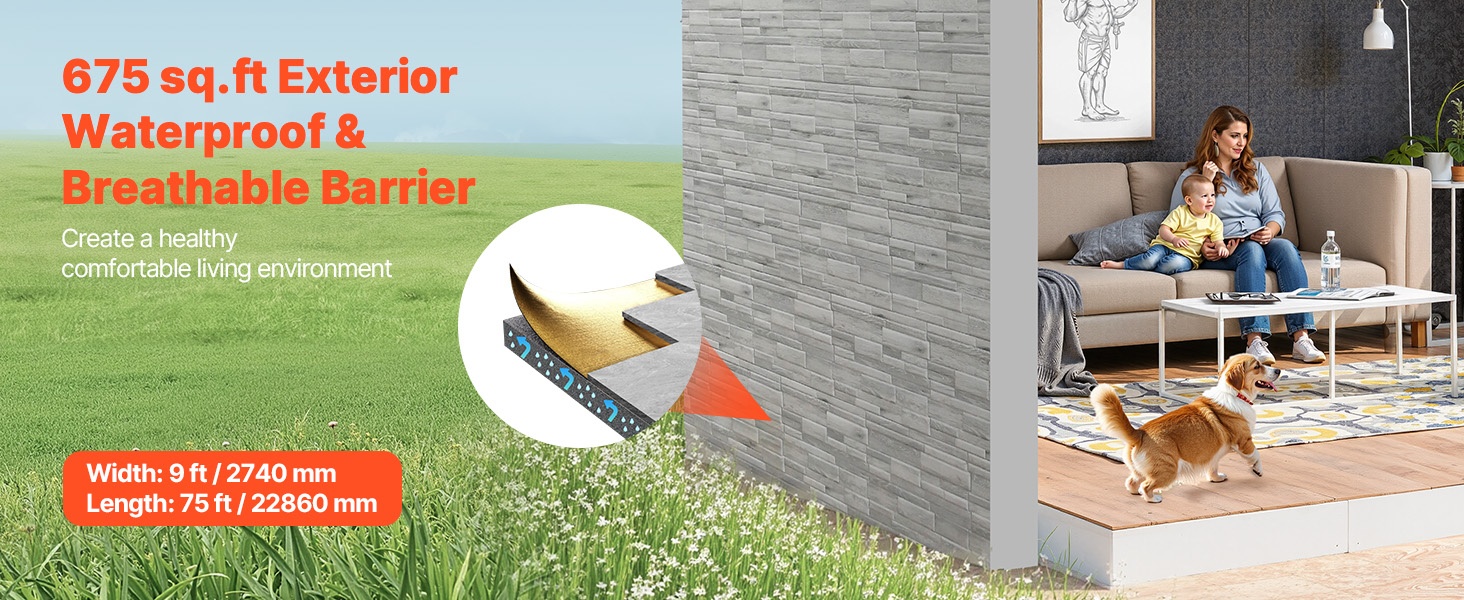 Monikäyttöinen höyrynsulkukalvo suojaa rakenteita kosteudelta ja vedolta sekä asuin- että liikerakentamisessa. Rulla kattaa jopa 10000 sq.ft / 92.9 m², joten saumoja ja leikkauksia tarvitaan vähemmän. Materiaali on samalla kertaa vedenpitävä ja hengittävä, mikä auttaa pitämään seinärakenteet kuivina ja kestävänä.