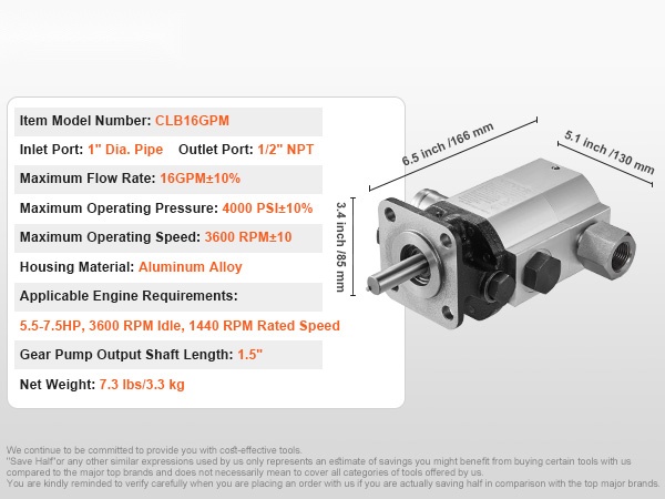 Hydraulinen hammastettu pumppu, jossa on kestävä, korroosionkestävä alumiiniseosrunko. Virtaus on 16GPM (noin 60.6 l/min) ja suurin työpaine 4000 PSI (27.6MPa), joten pumppu soveltuu erilaisten puulajien halkaisuun ja muuhun raskaaseen käyttöön pienmoottorin kanssa.