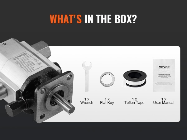 Hydraulisen hammastetun pumpun mukana toimitetaan kattava lisävarustesarja, johon kuuluu avain, tasoavain (flat key) ja teflonteippi. Näiden avulla asennus ja huolto onnistuvat ilman lisähankintoja.