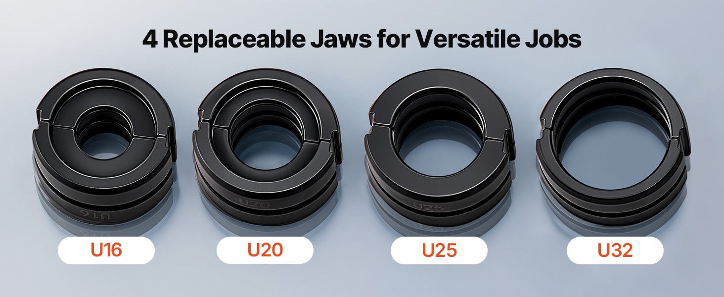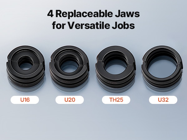 9 vaihdettavaa leukaa (TH16, TH20, TH26, TH32 ja V12, V15, V18, V22, V28) tarjoavat joustavan ratkaisun useille putkikoolle. Puristukset onnistuvat nopeasti, tarkasti ja tasaisesti eri asennuskohteissa.