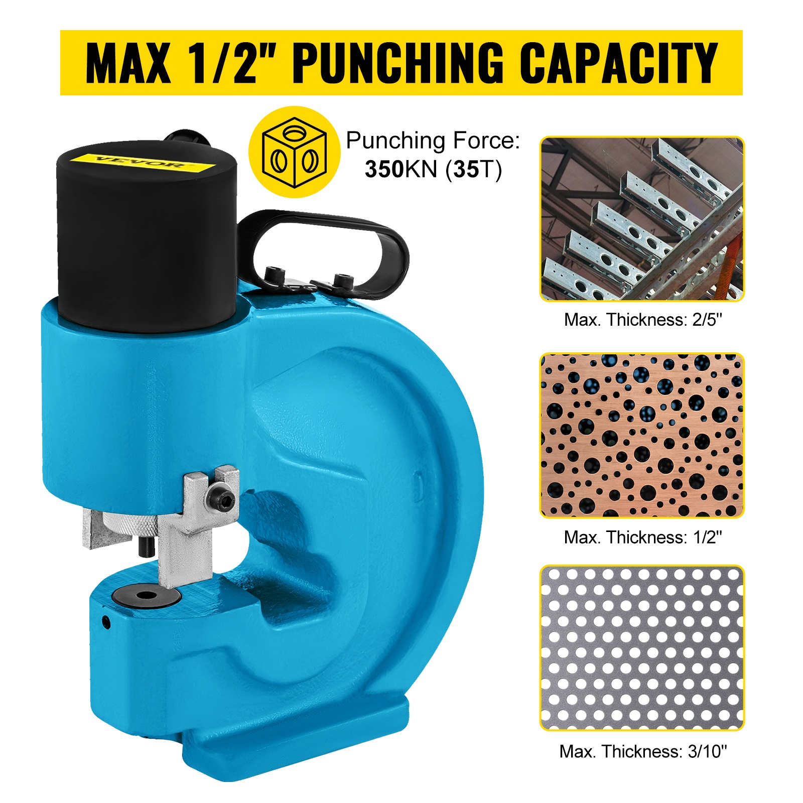 Tämä hydraulinen rei’itin soveltuu rautalevyille, joiden paksuus on 3–10 mm (1/10–2/5 tuumaa), kupari- ja alumiinilevyille, joiden paksuus on 3–12.7 mm (1/10–1/2 tuumaa), sekä ruostumattomalle teräkselle, jonka paksuus on 3–8 mm (1/10–3/10 tuumaa). Rei’itysvoima: 35T/350KN.