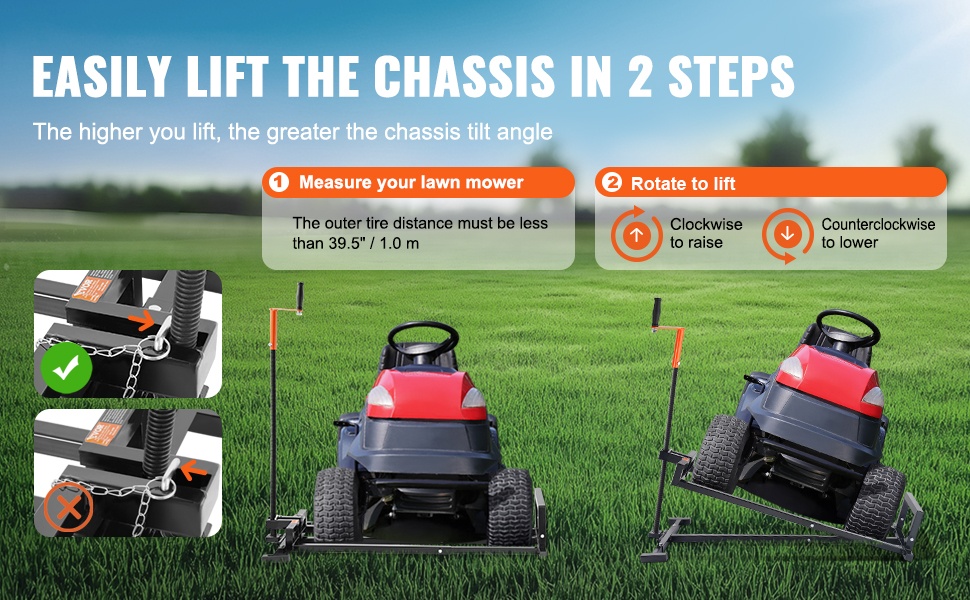 Hiiliteräksisestä nostimesta löytyy kummaltakin puolelta 4 leveyden säätöreikää, jotka lukitaan tapeilla. Tämän avulla voit sovittaa nostimen erilaisille rengaskokoille ja ajoneuvotyypeille, kuten ajoleikkureille ja zero turn -ruohonleikkureille.