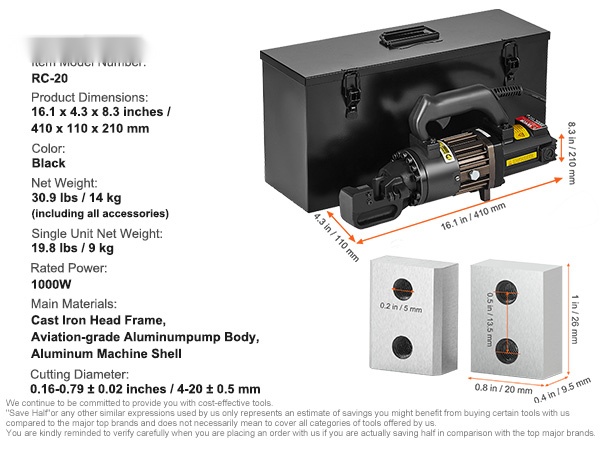Hydraulinen sähkökäyttöinen raudoitusleikkuri 1000W 4–20 mm RC-20