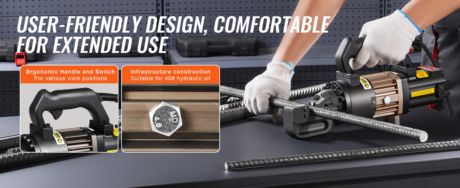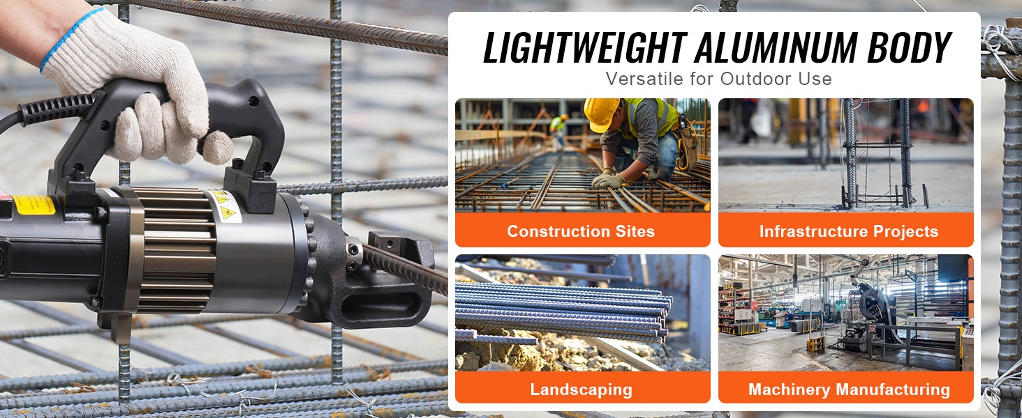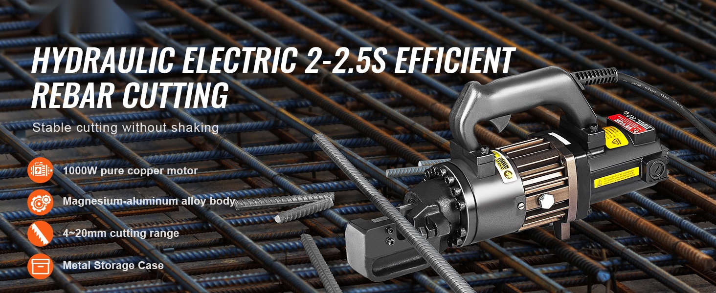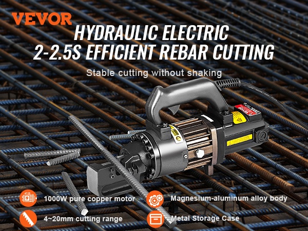 Sähkökäyttöinen hydraulinen raudoitusleikkuri katkaisee 4–20 mm teräkset 2,5–3 s. Kestävä runko, ergonominen kahva, kaksipuoliset terät ja työkalusarja mukana.